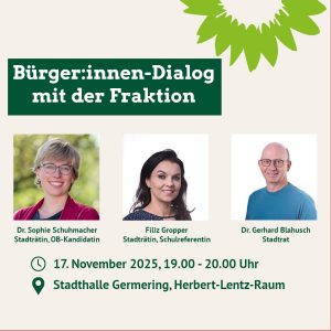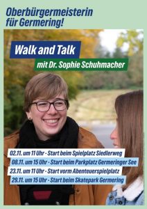 Unsere Oberbürgermeisterkandidatin Dr. Sophie Schuhmacher lädt am Samstag, 2. November, um 11 Uhr zum ersten Mal zu ihrem neuen Format „Walk and Talk“ ein. Treffpunkt ist der Spielplatz am Siedlerweg. Interessierte Bürgerinnen und Bürger