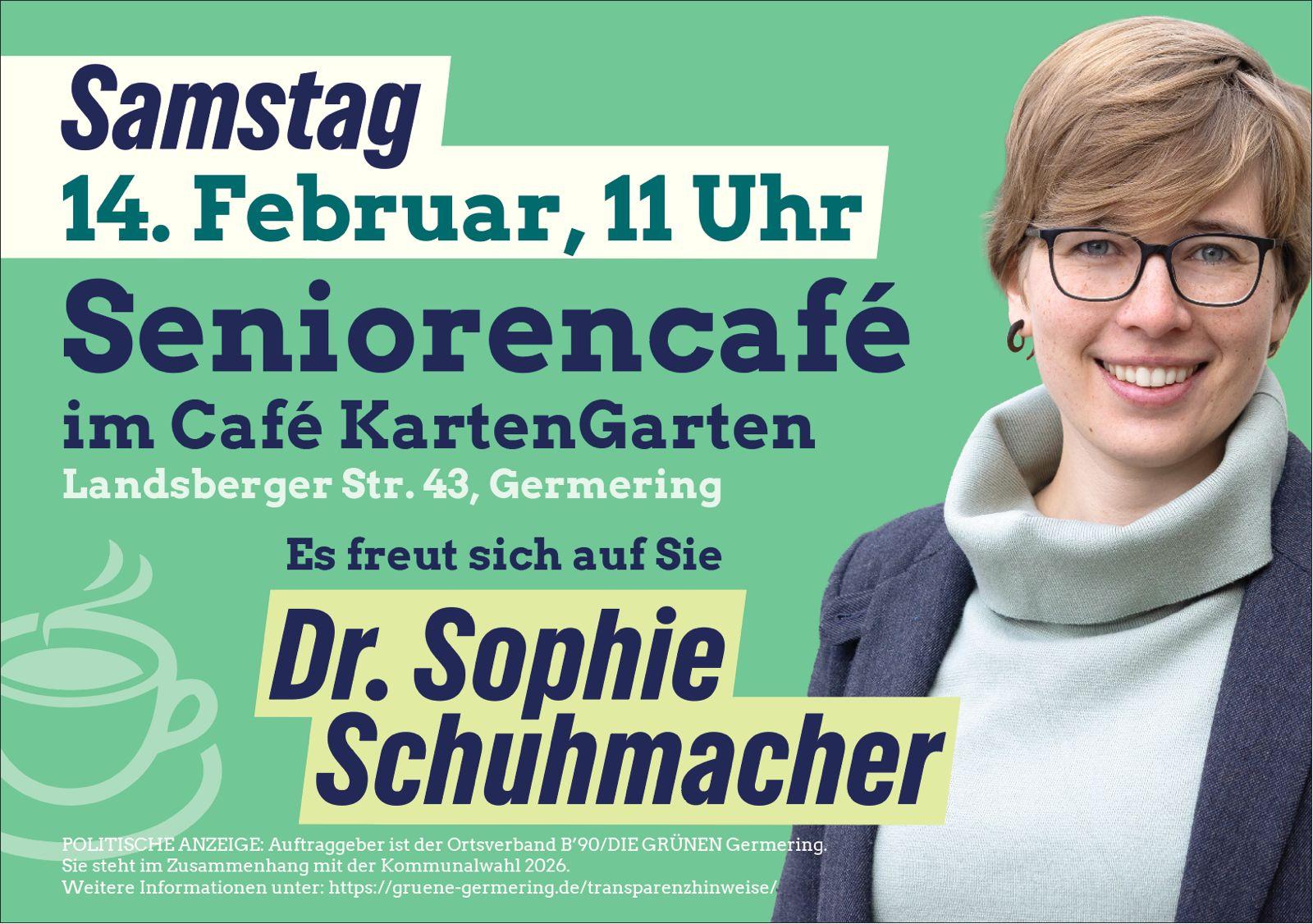 Am 14.02.2026 um 11 Uhr trifft sich unsere OB-Kandidatin Dr. Sophie Schuhmacher mit interessierten Senioren und Seniorinnen im Café KartenGarten, Landsberger Straße 43, zu einer lockeren Gesprächsrunde.