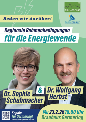 Dr. Sophie Schuhmacher und Dr. Wolfgang Herbst von Bündnis 90 / Die Grünen laden ein zum Wirtschaftsabend mit regional verwurzelten Unternehmen und Handwerksbetrieben im Brauhaus Germering (Dorfstraße 15) am 23.02.2026 ab 18:00 Uhr. Zusammen mit Ronja von Wurmb-Seibel (Landratskandidatin) und Andreas Birzele (Beauftragter für das Handwerk und Sprecher für Kommunales der grünen Fraktion im Bayerischen Landtag) reden wir über die notwendigen Rahmenbedingungen für den Erfolg der Energiewende vor Ort.