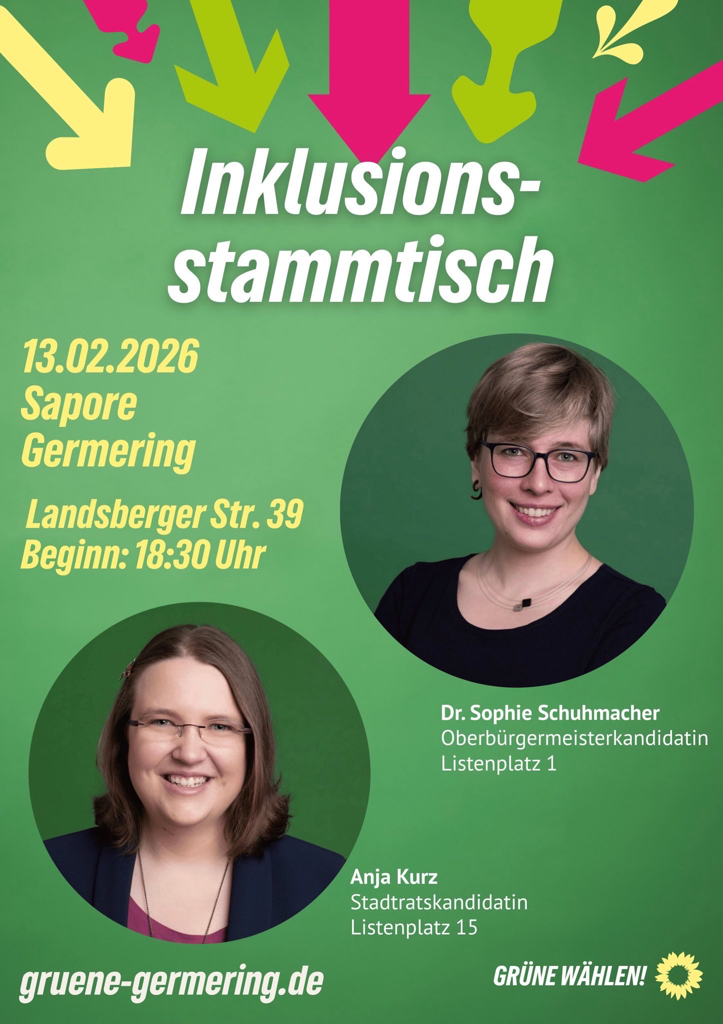 Für den 13.02.2026 um 18:30 Uhr laden unsere Oberbürgermeisterkandidatin Dr. Sophie Schuhmacher und unsere Stadtratskandidatin Anja Kurz alle Bürger:innen ein, sich beim Inklusionsstammtisch im Sapore (Stadthallenrestaurant) auszutauschen.