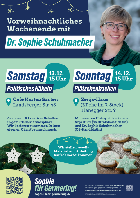 Am Sonntag wiederholen wir das schon im letzten Jahr beliebte Plätzchenbacken. Zusammen mit Anja Kurz und Dr. Sophie Schuhmacher könnt ihr im 3. Stock des Mehrgenerationenhauses, Planegger Straße 9, ab 15 Uhr euer Weihnachtsgebäck backen.