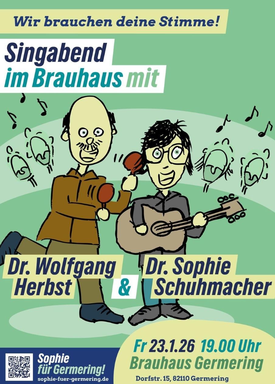 Am 23.01.2026 treffen wir uns im Brauhaus Germering, Dorfstraße 15, ab 19 Uhr zum Singen. Unter „fachkundiger“ Anleitung von Dr. Wolfgang Herbst und Dr. Sophie Schuhmacher wollen wir einen gemütlichen Abend mit euch verbringen.