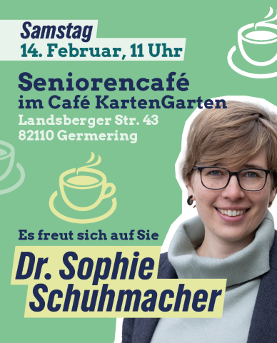 Anliegen, Wünsche und Bedürfnisse verändern sich im Laufe eines Lebens. Am 14. Februar sollten die von Seniorinnen und Senioren im Fokus stehen: Welche Angebote müssen unbedingt erhalten bleiben, wo kann Germering noch besser werden? Im Café Kartengarten stand Dr. Sophie Schuhmacher für einen Austausch bei Kaffee und Kuchen zur Verfügung.