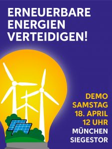 Am Samstag, dem 18.04.2026 gibt es unter dem Slogan „Erneuerbare Energien verteidigen“ bundesweite Demos gegen die Energiepolitik der Bundesregierung, siehe https://erneuerbare-energien-verteidigen.de. Die Demo in München startet um 12 Uhr am Siegestor (U-Bahn Universität).